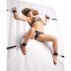 The Frisky Bedroom Restraint Kit is portable and easily restrains with H-shaped straps that fit underneath any size bed and reach around to securely cuff ankles and wrists and restrict movement. The sturdy Neoprene cuffs are soft and comfortable, yet close securely with heavy duty Velcro. Swivel clips attach the cuffs to straps underneath the mattress. Enjoy putting your partner in compromising positions as you tease and please them until you decide they are released!