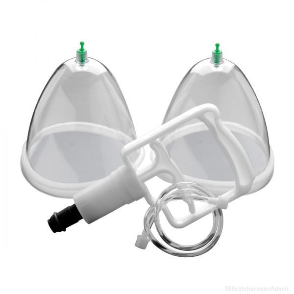 Create temporary engorgement of the breast area with a hand-pumped cupping system! Each of the two large cups has a rubber ring around the base to create a strong seal when you place it on your skin. Attach the green end of the tubing to the green tips of the cups and the white end of the tubing to the hand pump. Pull the pump trigger to create suction, working towards your comfort level. The tubing can be removed and your flesh will stay caught in the pressure of the cup. Press down on the green tip to easily release the suction. Experiment with enlargement and increased sensitivity on your own or with a partner!